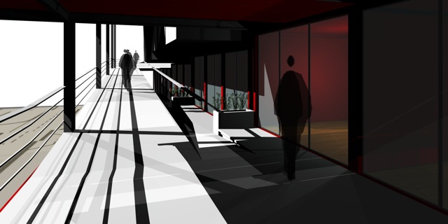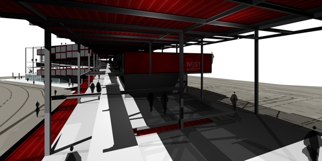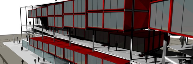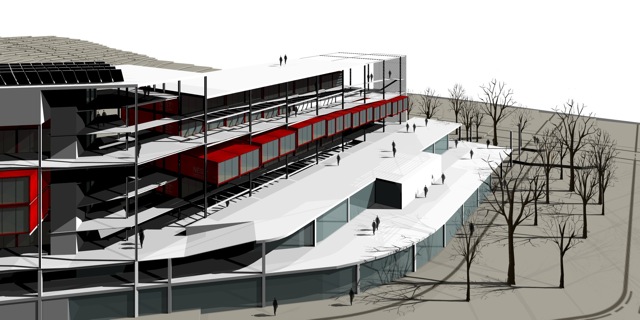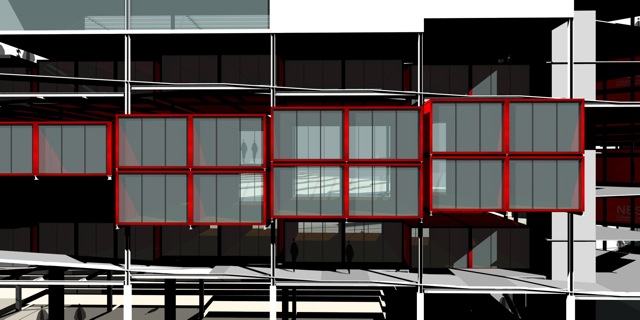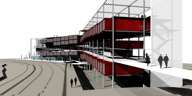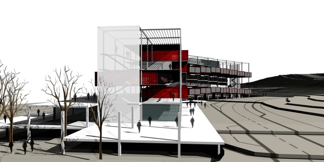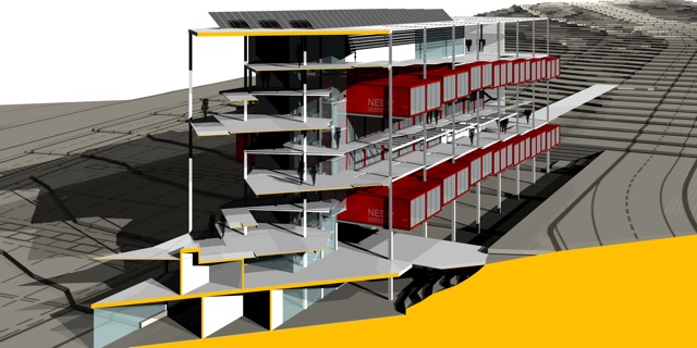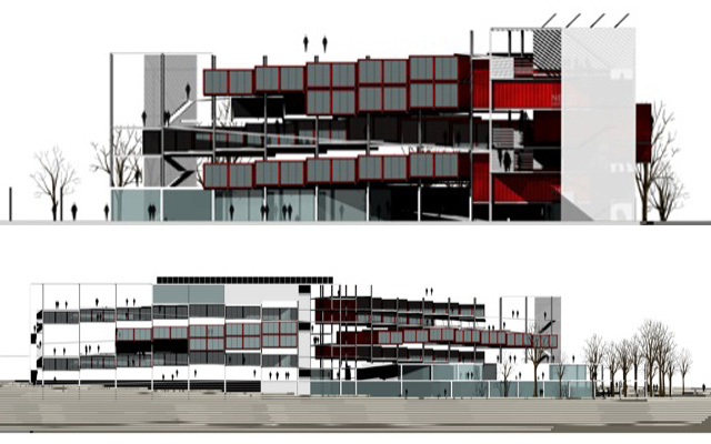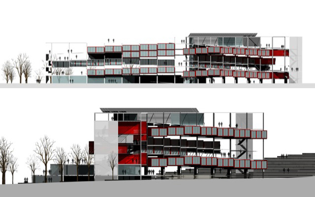 Imatges infogràfiques per a la presentació d’un Macroedifici que combina diferents usos d’equipaments amb habitatges en contenidors.